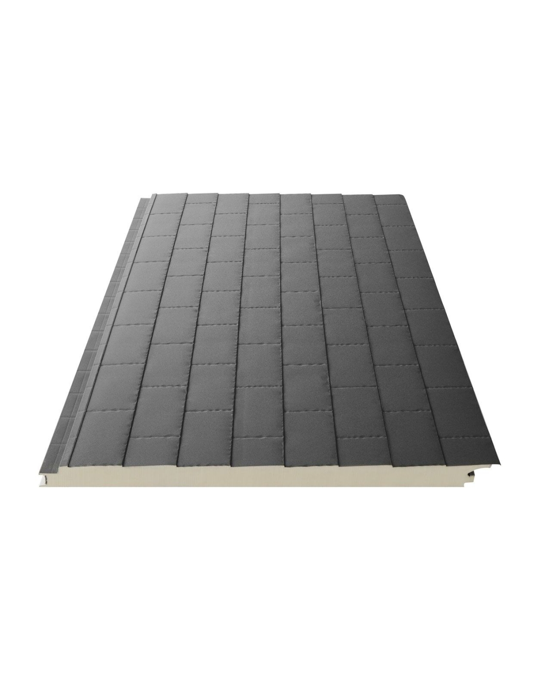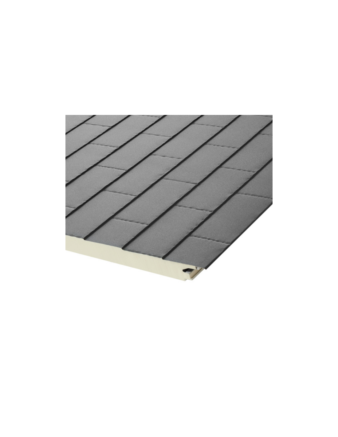 Sandwichpanel med skifferliknande, dekorativ yta och kärna av hårt polyuretanskum (PIR) för effektiv värmeisolering- Kan användas på lutande tak (min. 25°) samt på fasad. Möjliggör ett modernt, minimalistiskt uttryck där tak (utan takfot) och väggar kan bilda en sammanhållen, designpräglad volym. Finns i längder 2,5–12,0 m och tjocklekar 60–120 mm.