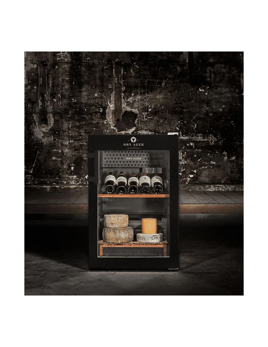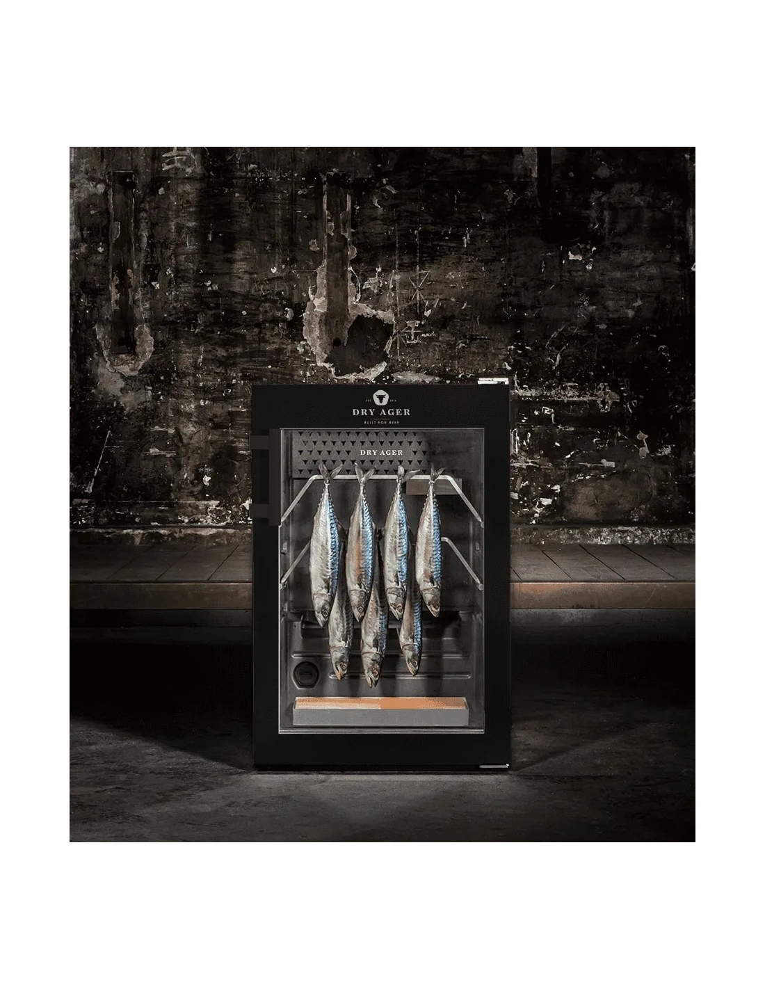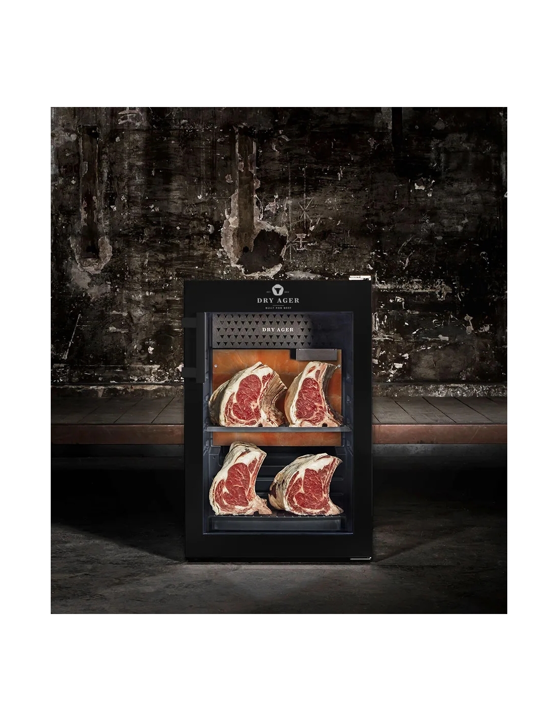 Hängmörningsskåp rostfritt/svart 155/134L DX500 Premium S Dry Ager- Helt i svart pulverlackering ELLER hölje och dörr i rostfritt stål ELLER specialfärgad- Låsbar dörr- Innerbehållare, antibakteriell polystyren - Innervägg, DX-LED Salt Wall System. Med 10 olika ljusfärger- Isolerande glasdörr, UV-skydd, tonad (metalliserad)